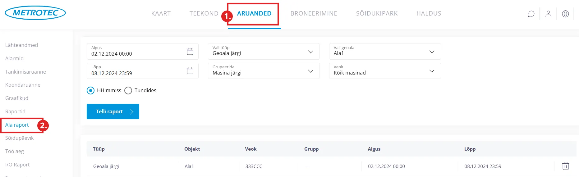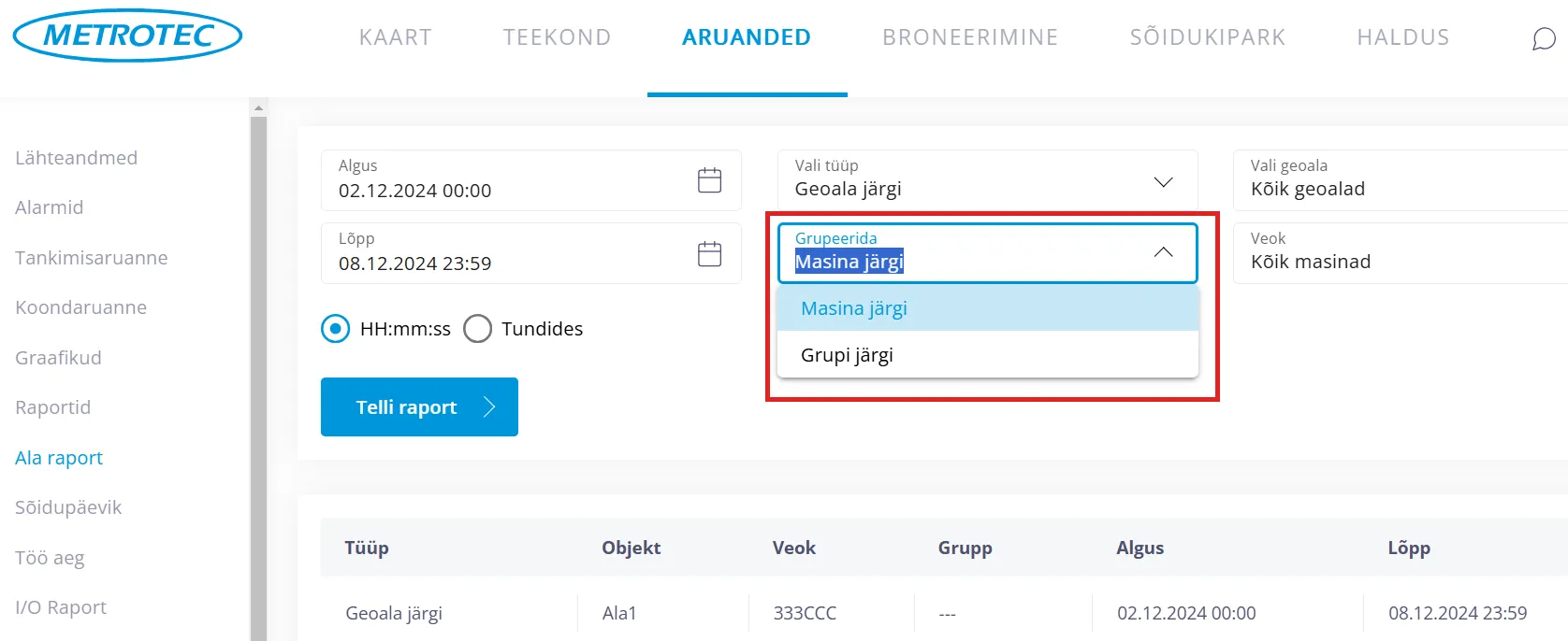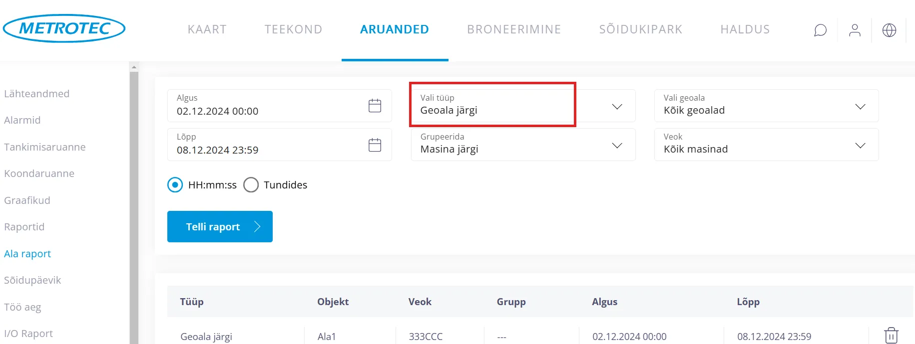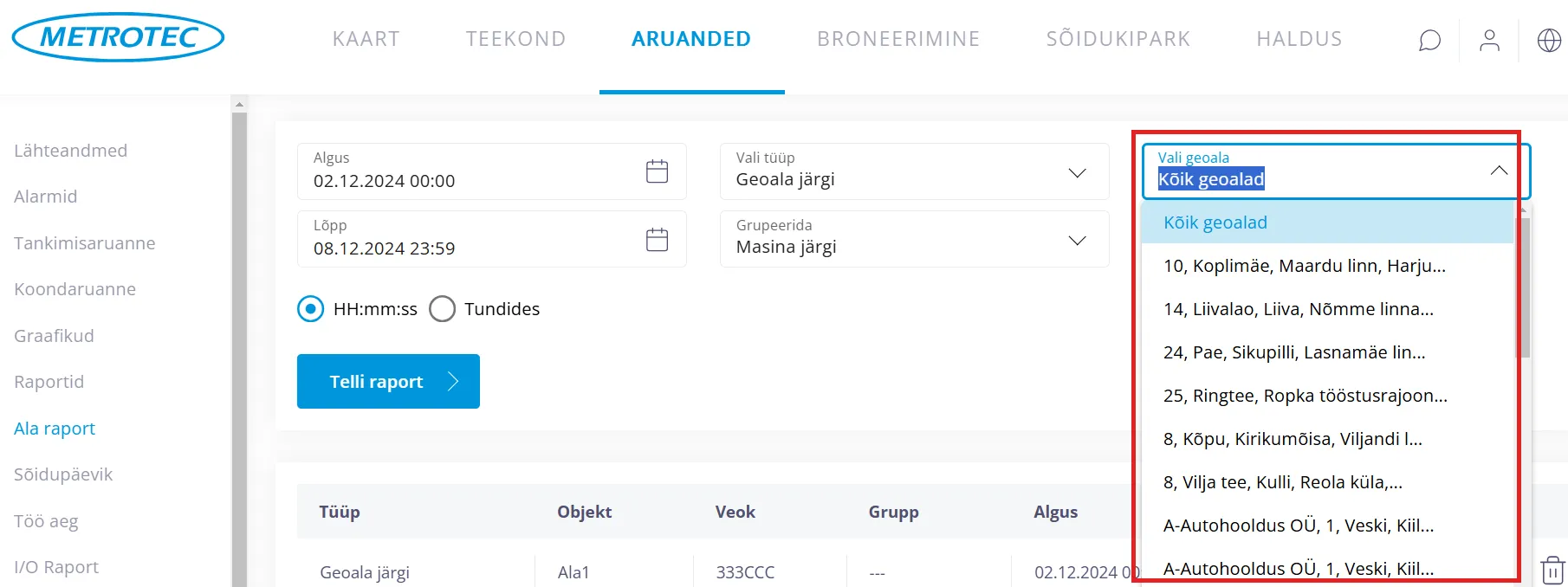 Ala raporti tegemiseks “Geoala järgi” toimi nii: