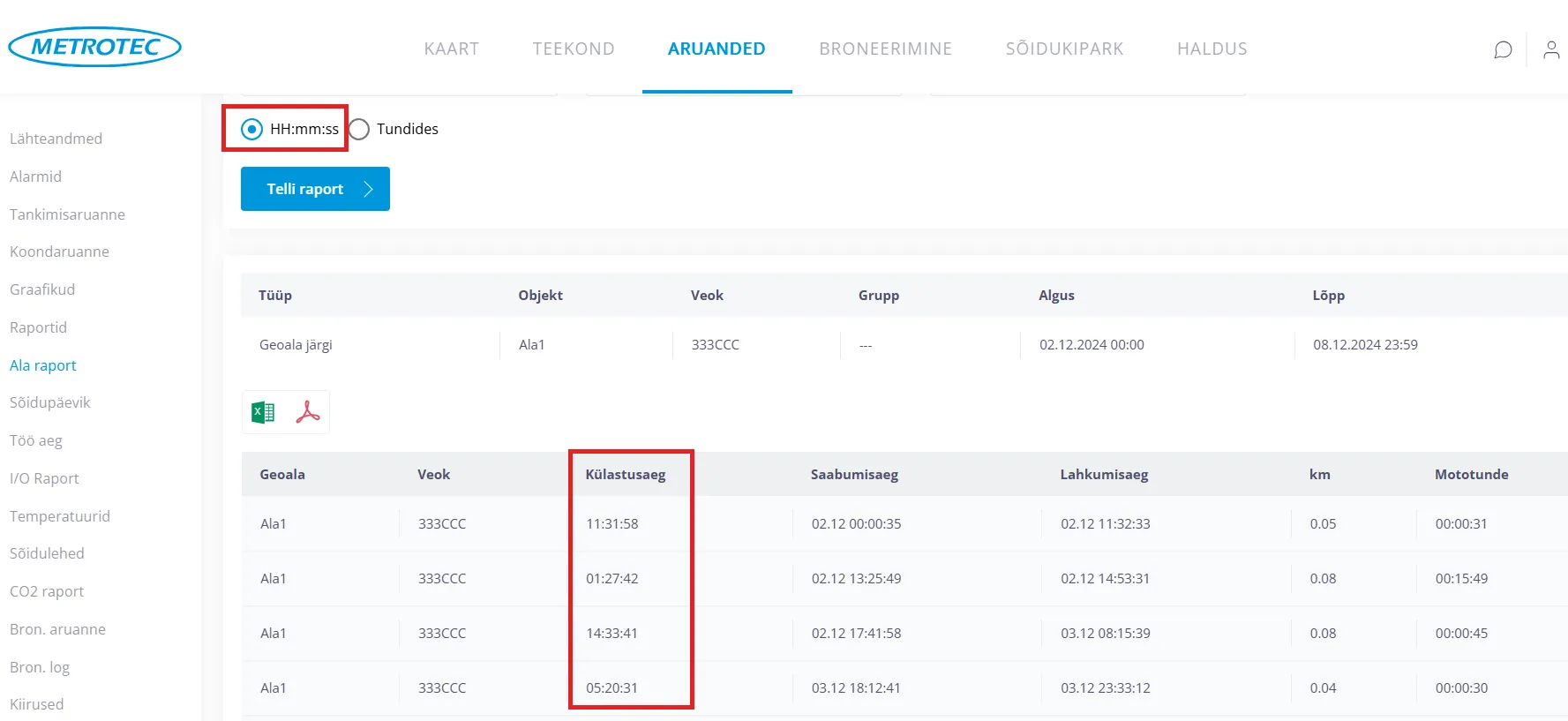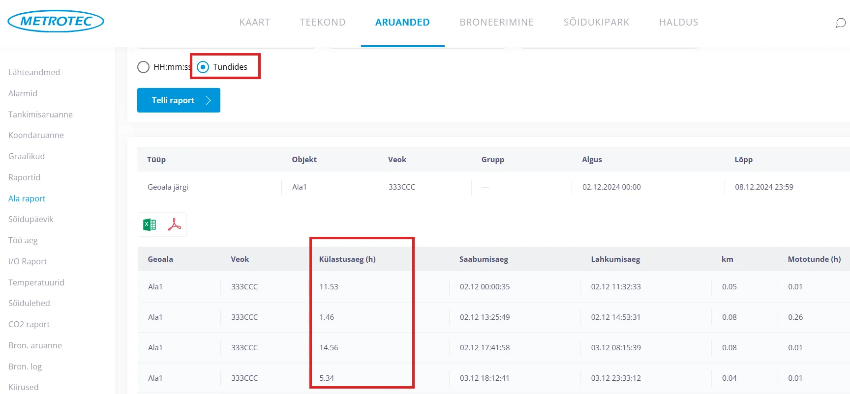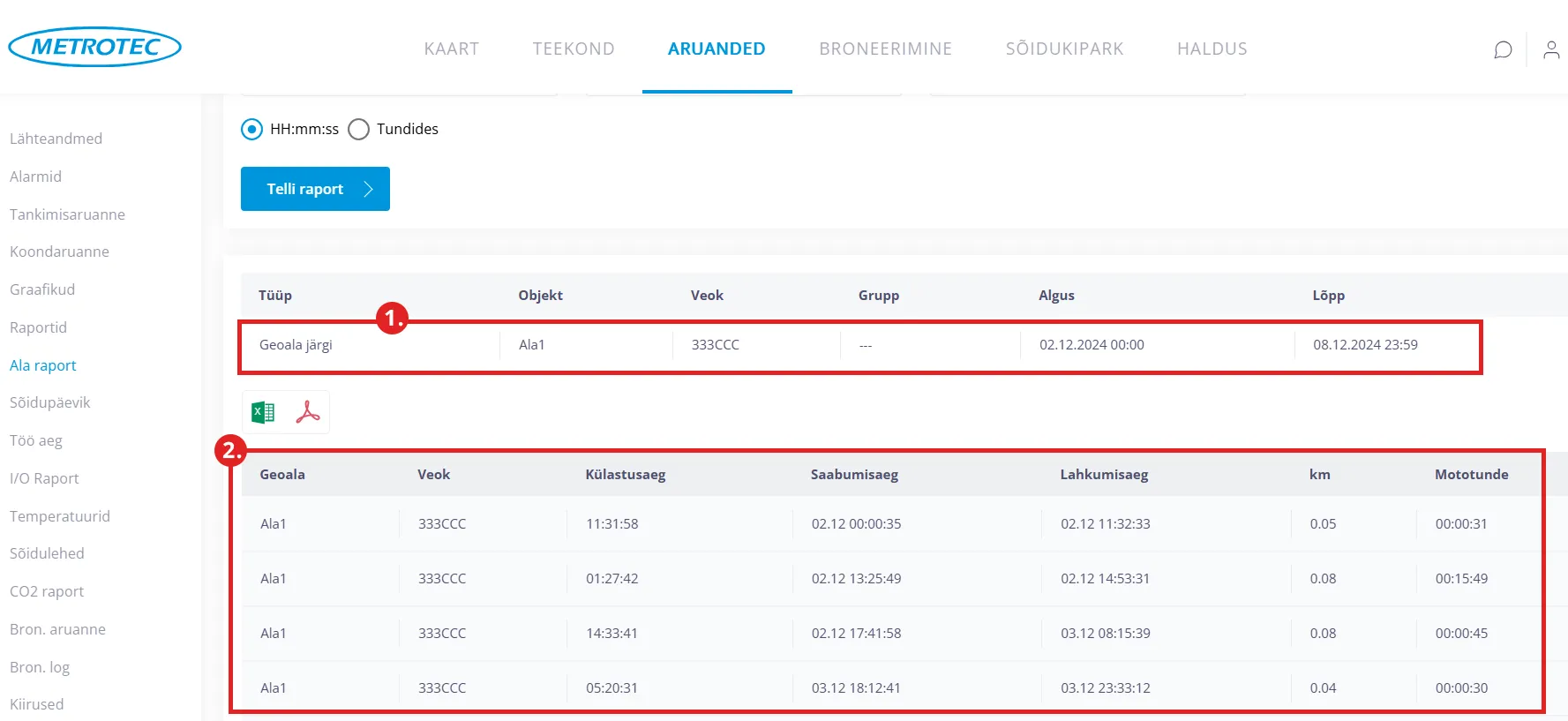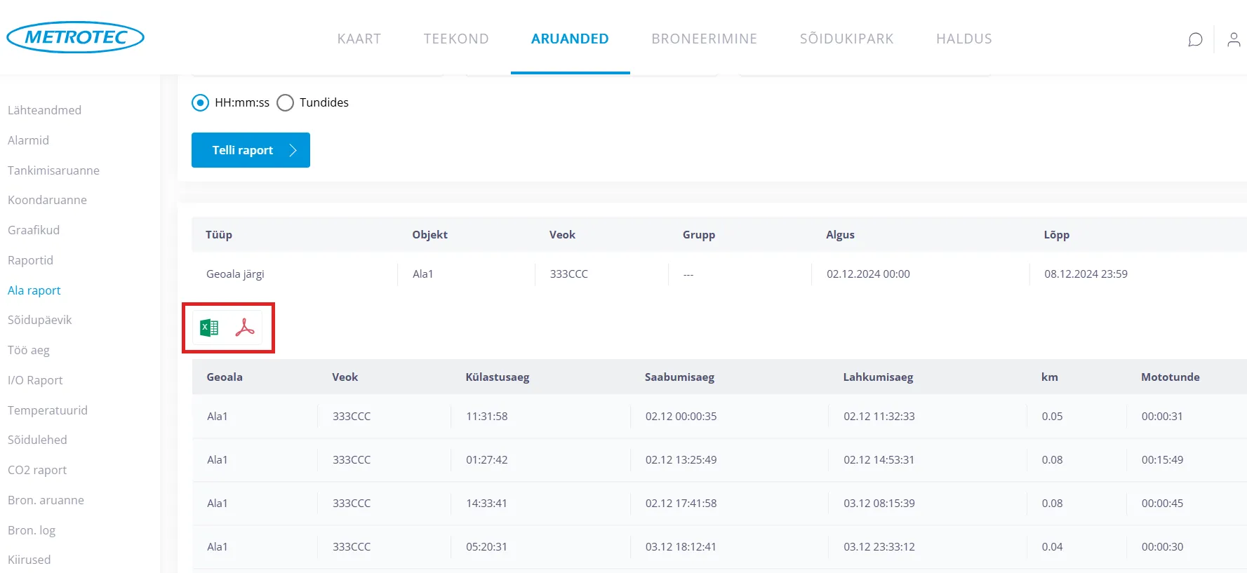 Soovi korral saab ala raporti eksportida Exceli või PDF faili.