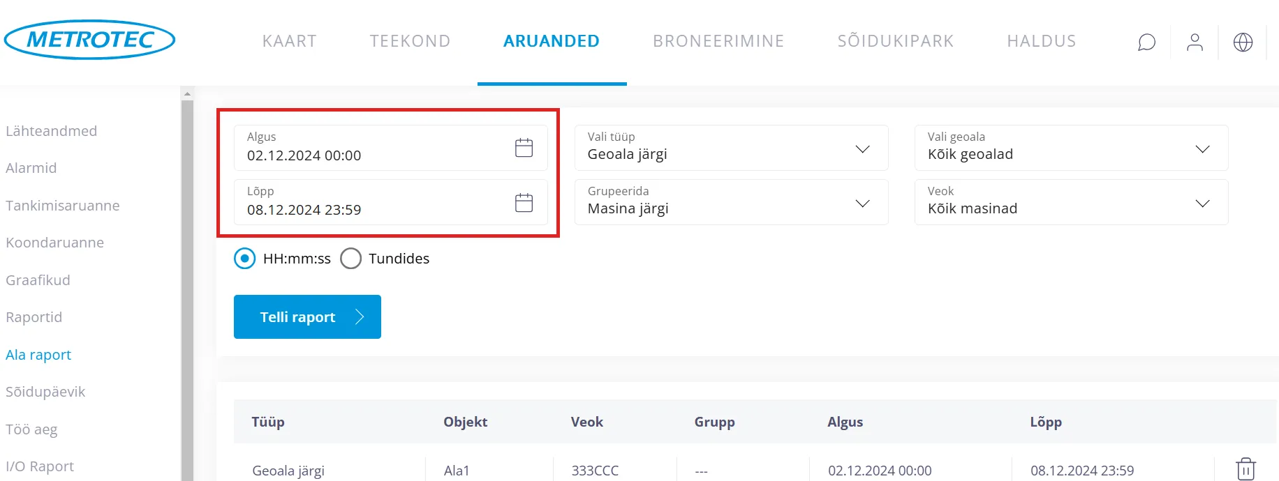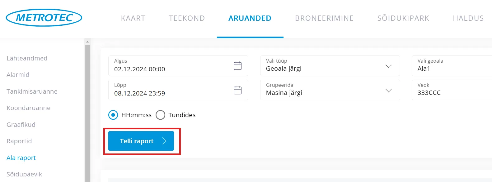 Määra ajavahemik, mille kohta soovid “Ala raporti” teha.