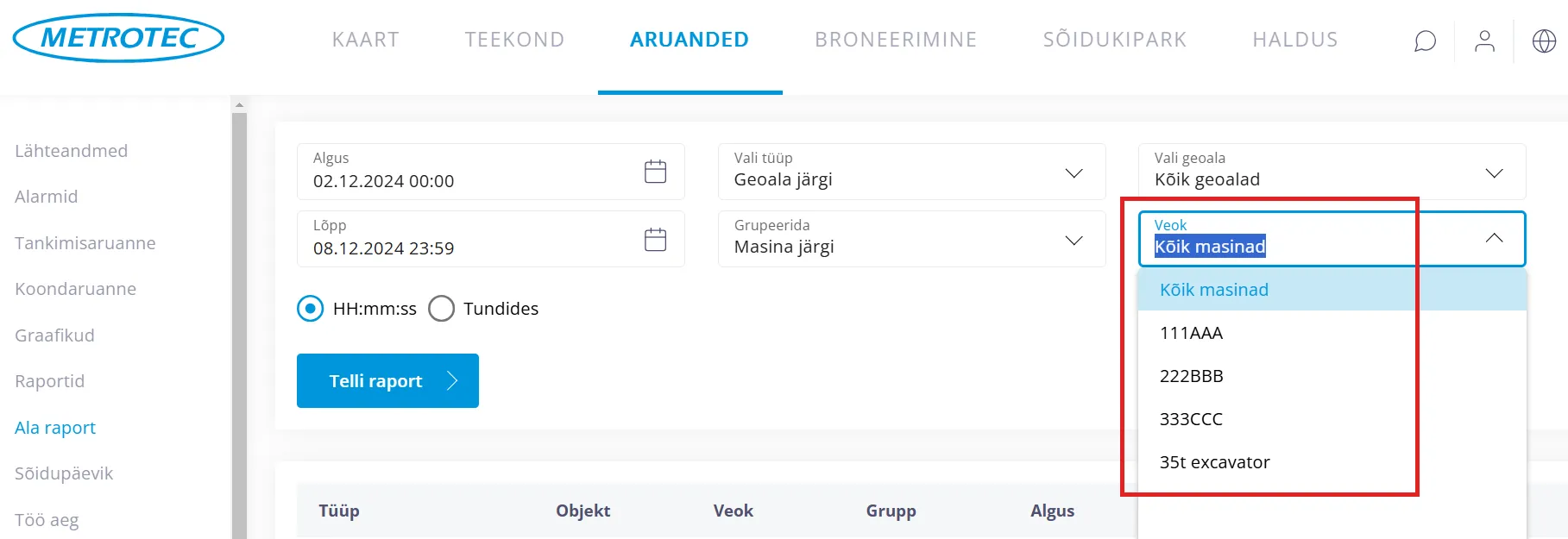 “Veok” kastikeses saab jätta “Kõik masinad”, mille puhul tehakse raport kõikide sõidukite kohta. Või valida
