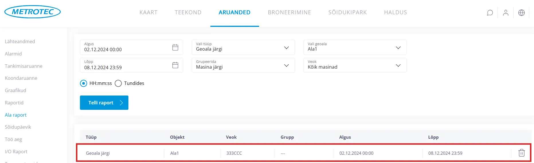 Ala raport aitab tuvastada sõidukeid, mis on määratud aladel viibinud. Raportist leiad teavet alale sisenemise ja väljumise aja, alal viibitud aja, läbitud kilomeetrite ning kulutatud mootori töötundide kohta.