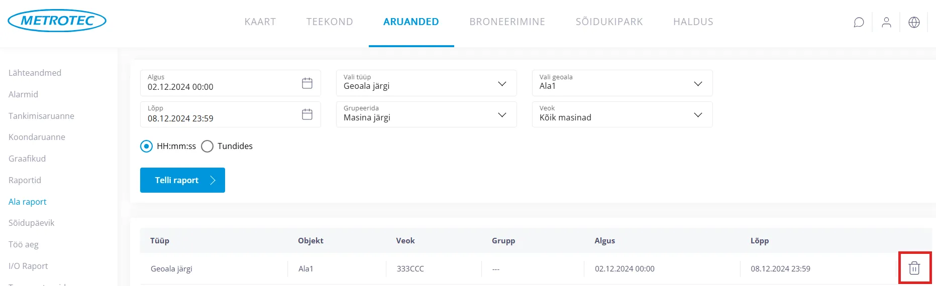 Rea lõpus “Prügikasti” ikooni peal klikates saab ala raporti kustutada.