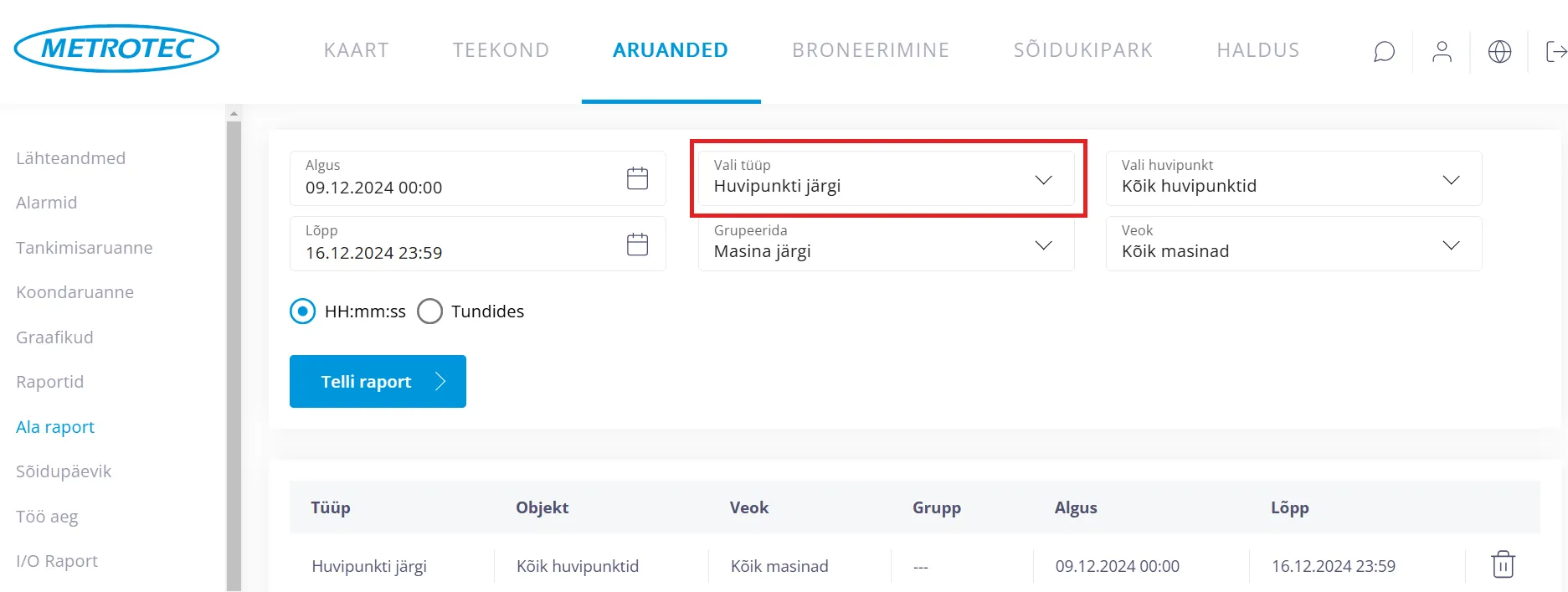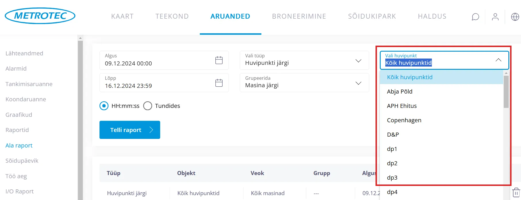 “Vali huvipunkt” kastikeses saab jätta “Kõik huvipunktid”, mille puhul tehakse raport kõikide olemasolevate