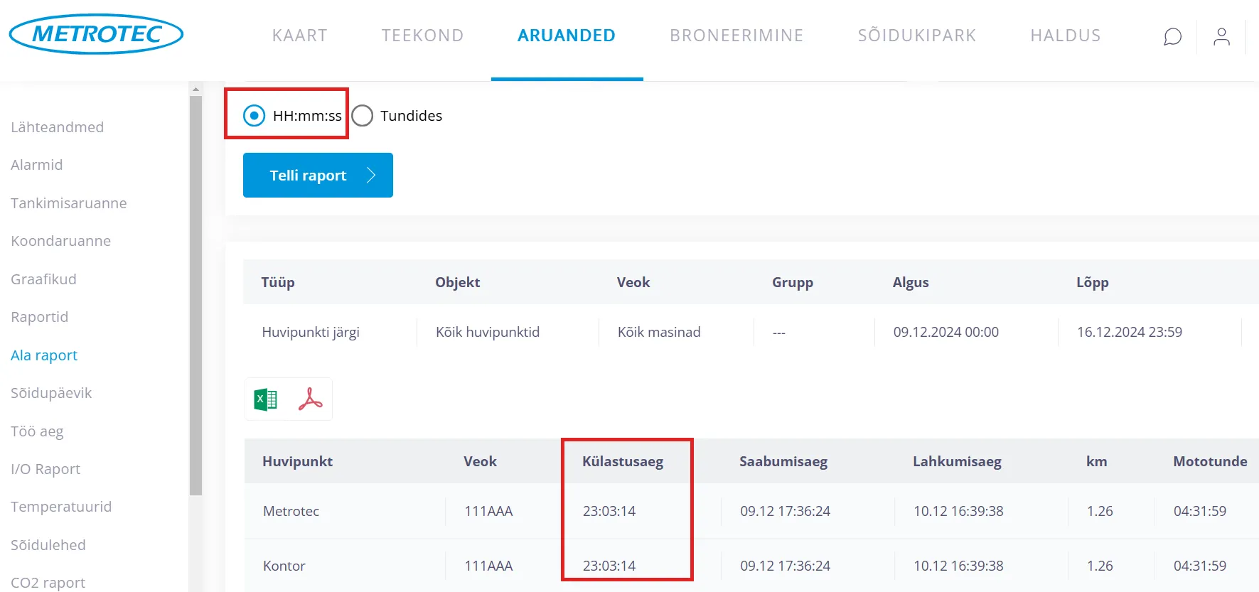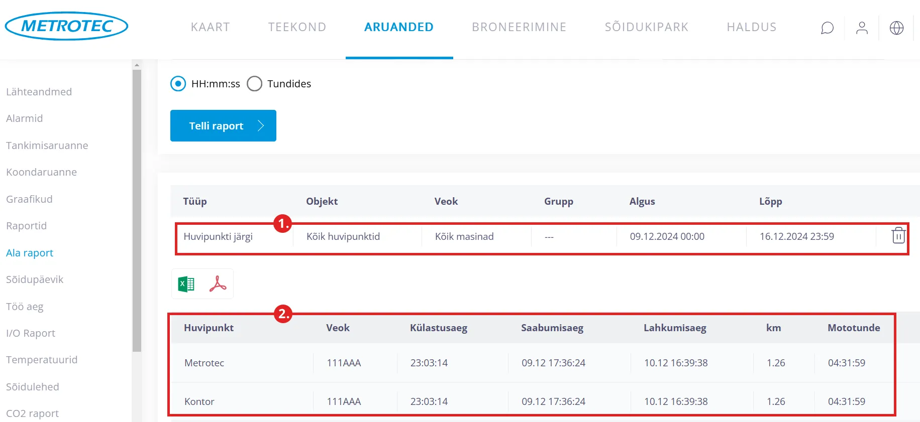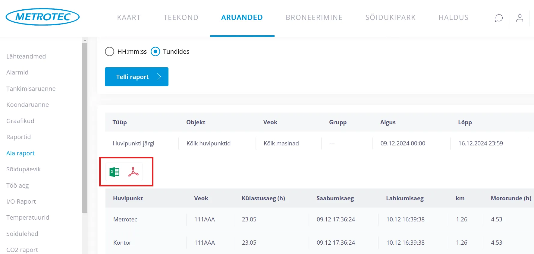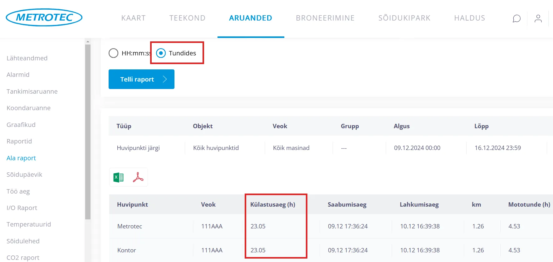 Soovi korral saab ala raporti eksportida Exceli või PDF faili.