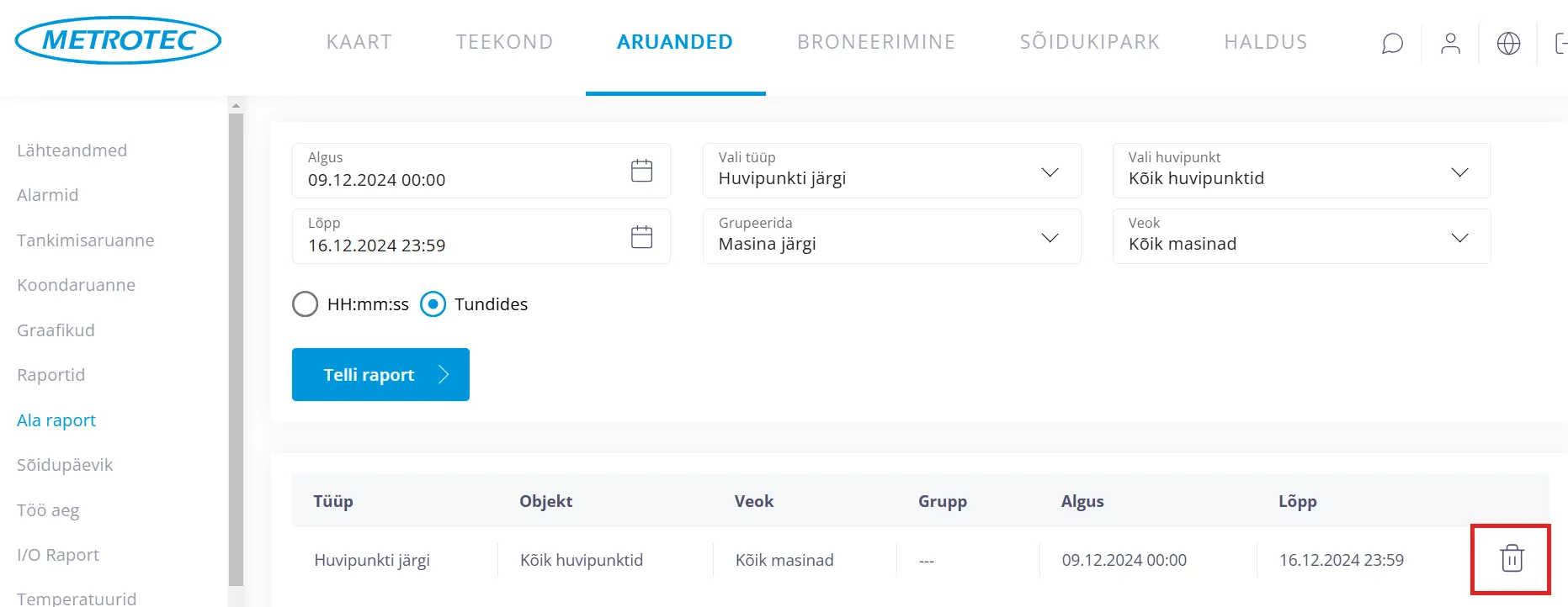 Rea lõpus “Prügikasti” ikooni peal klikates saab ala raporti kustutada.