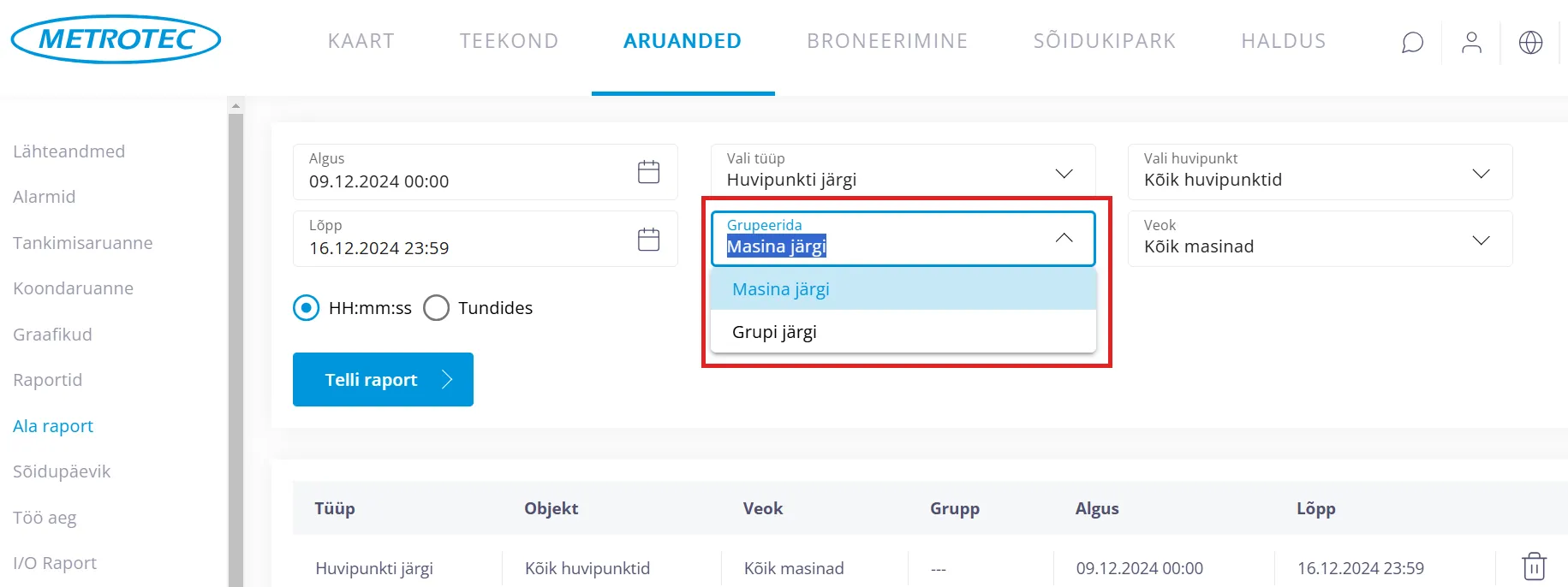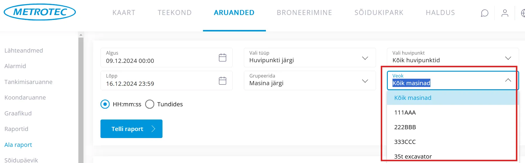 “Veok” kastikeses saab jätta “Kõik masinad”, mille puhul tehakse raport kõikide sõidukite kohta. Või valida