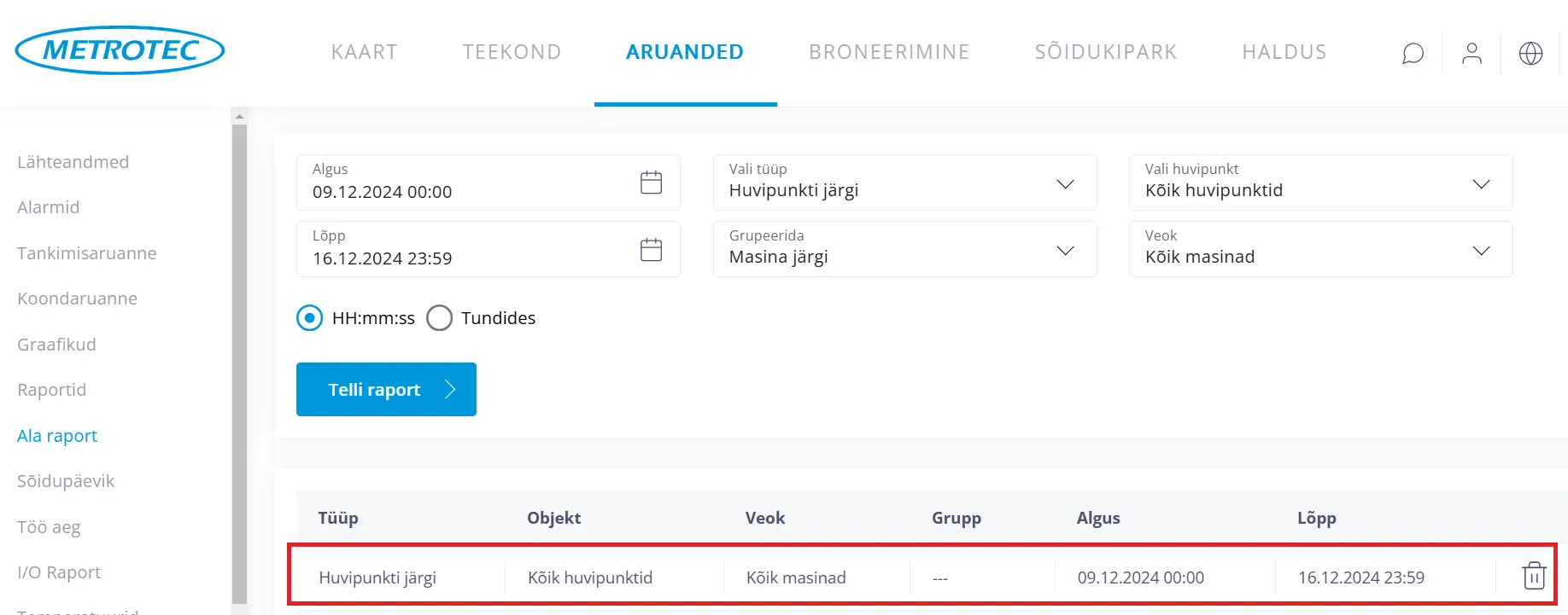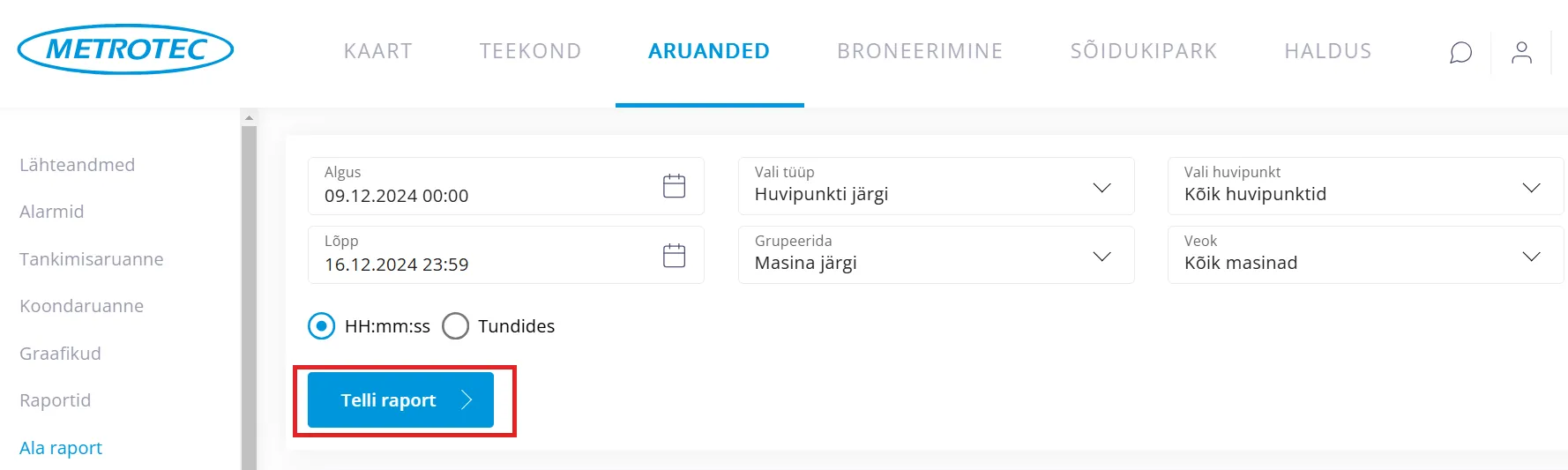 Määra ajavahemik, mille kohta soovid “Ala raporti” teha.