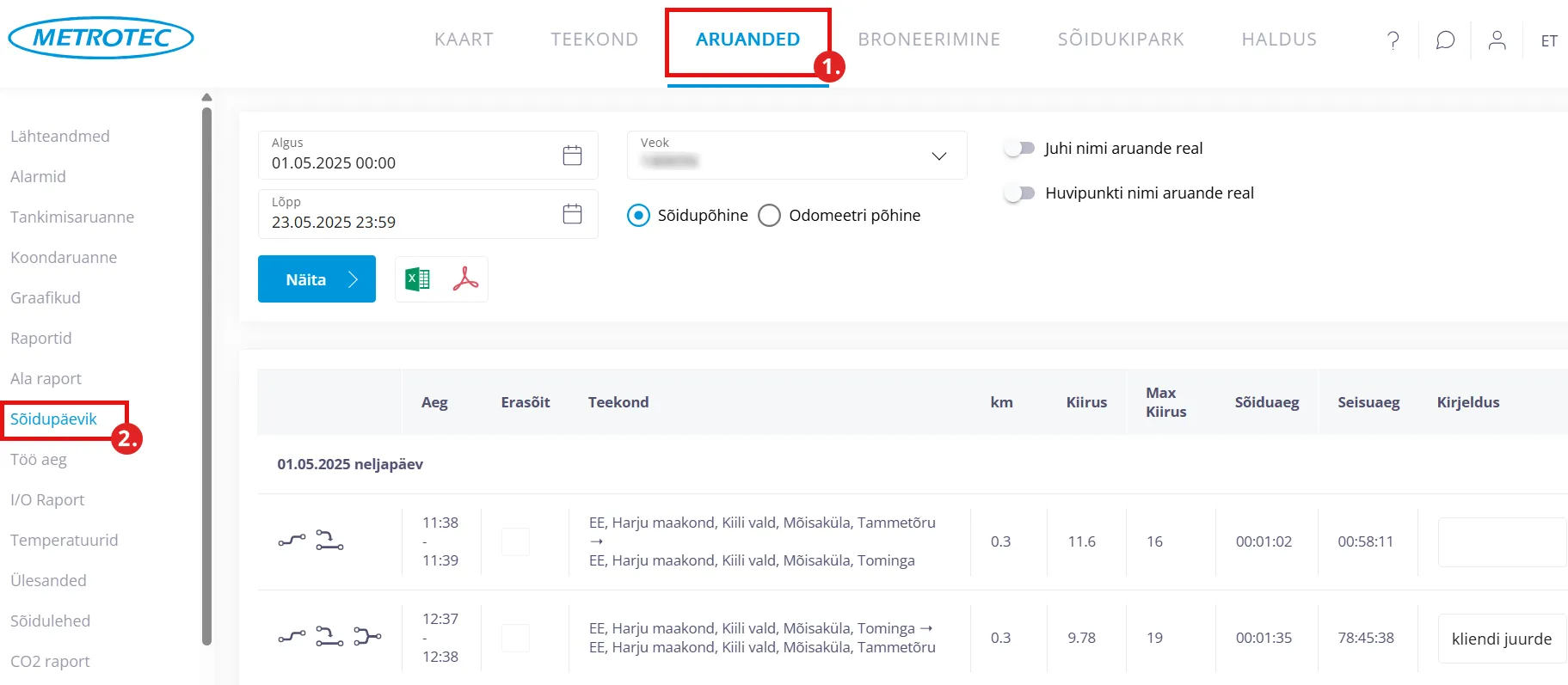 - Saadud andmeid on võimalik Metrotec keskkonnast ka eksportida. Selleks vali, kas soovid Exceli või PDF formaadis faili, klikates vastaval ikoonil. NB! Mahukamate failide allalaadimine võib pisut aega võtta.