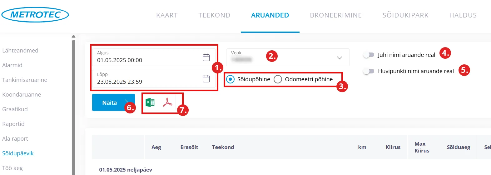 - Veok - millise masina sõitude kohta aruannet näidatakse