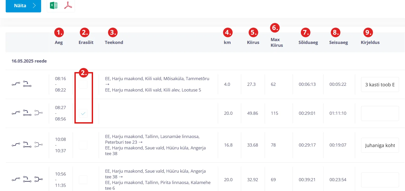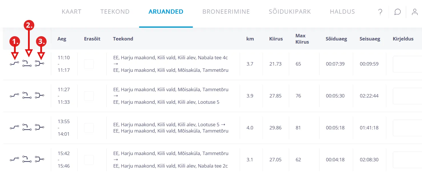- Aeg - näitab sõidu alguse- ja lõpuaega.