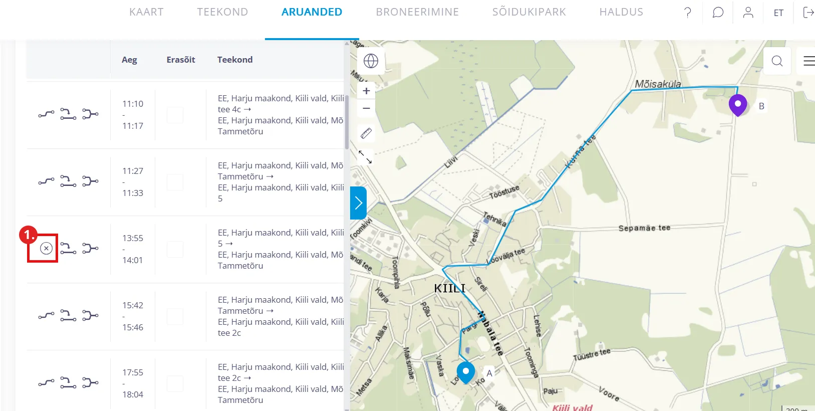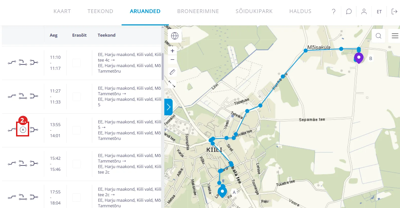 - Teekond - sellele klikates avaneb eraldi vaatena antud sõidu täpne teekond kaardil.