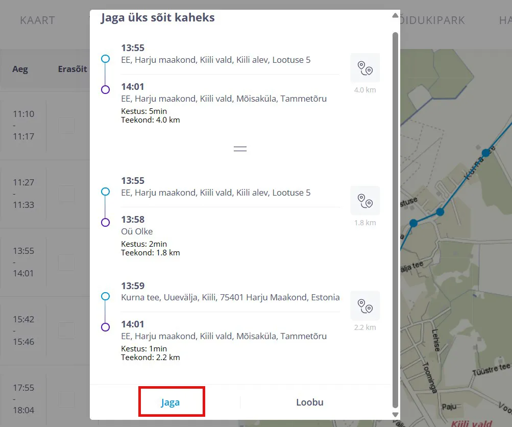 Peale seda kui klikid nupul “Jaga” siis tekib ühest sõidust kaks eraldi sõitu.