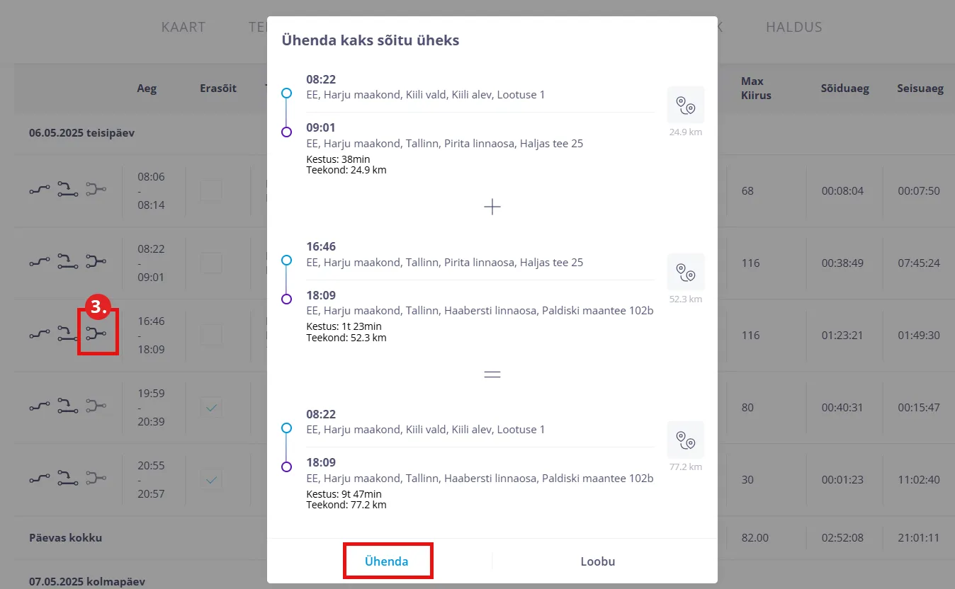 heading.anchorLabel- Klikates sõidu kokkuliitmise nupule ilmub aknake pealkirjaga “Ühenda kaks sõitu üheks”. Süsteem võtab sõidu, millele klikkasid ja sellele eelneva sõidu ning liidab nad kokku. Kokkuliitmiseks vajuta nupule “Ühenda”.