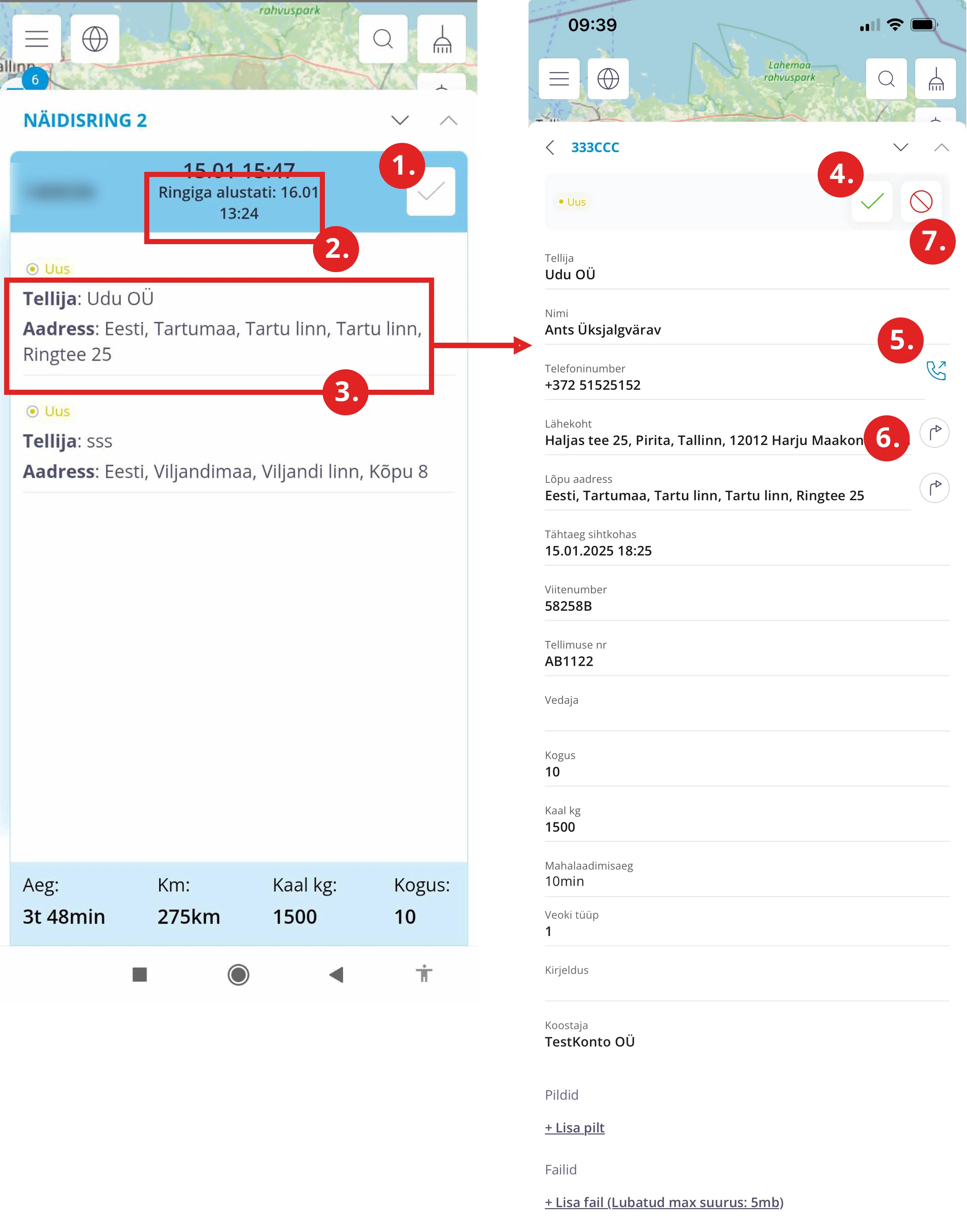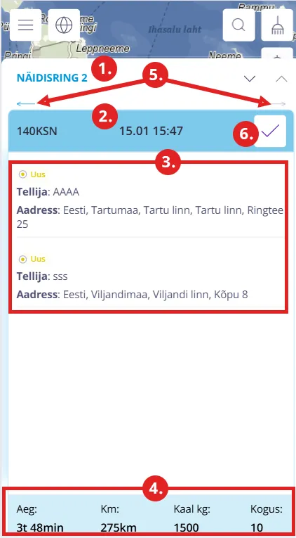 - Kogu ringi tegemiseks kuluv aeg, kilometraaž ning kauba kogus ja kaal