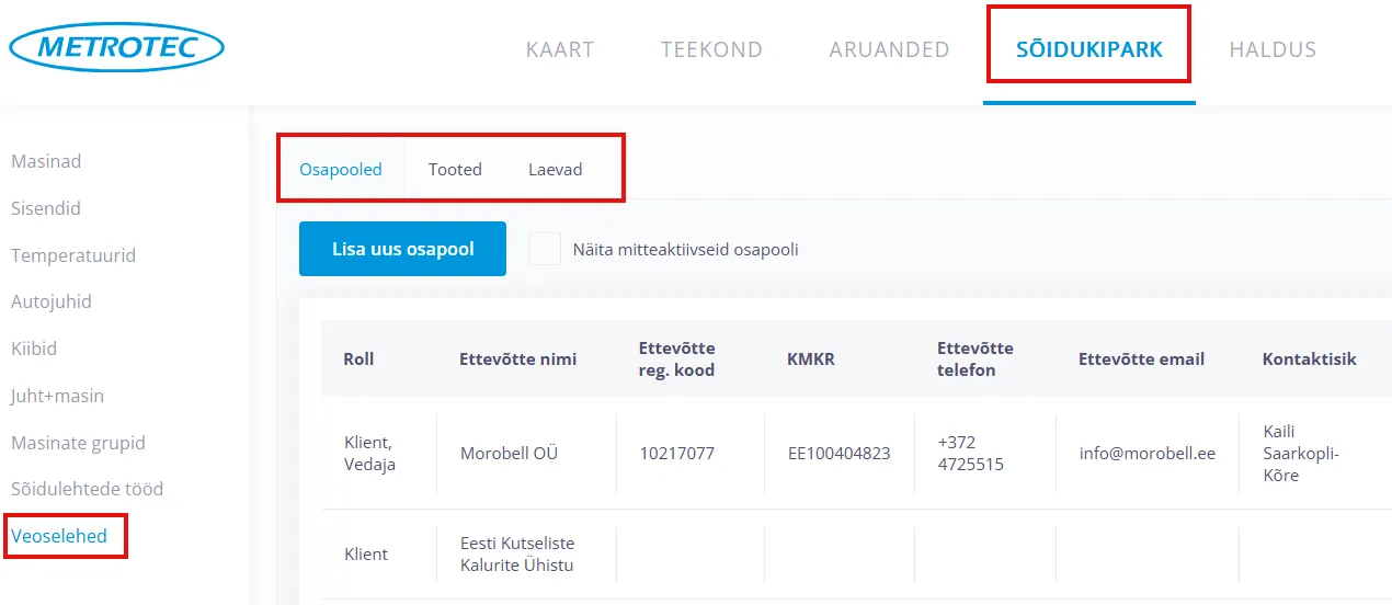 heading.anchorLabelTranspordidokumentide seadistamiseks liigu menüüs Sõidukipark > Veoselehed. Avanevas vaates on võimalik lisada osapooled, tooted ja laevade andmed.