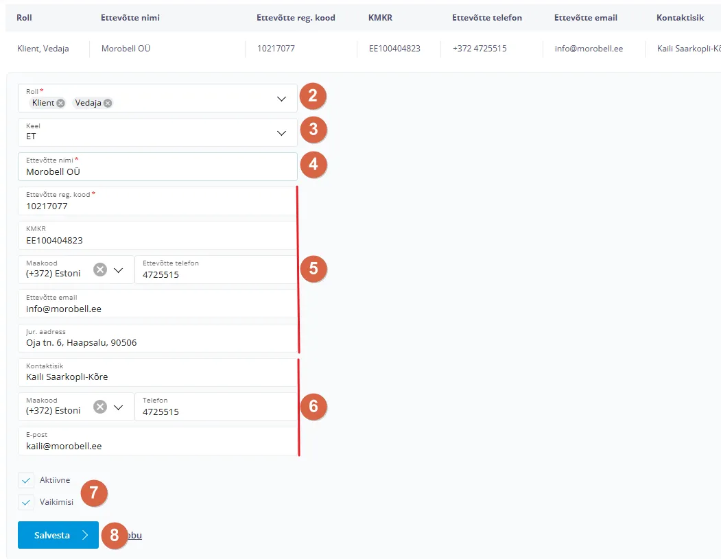 - Aktiivne = saab rippmenüüdest osapoolt valida, Vaikimisi = vaikimisi valik rippmenüüdes