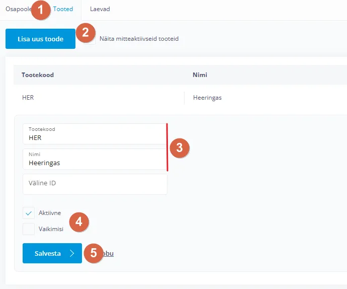 heading.anchorLabelToodete lisamiseks liigu Veoselehtede seadistamise vaates Toodete menüüle.