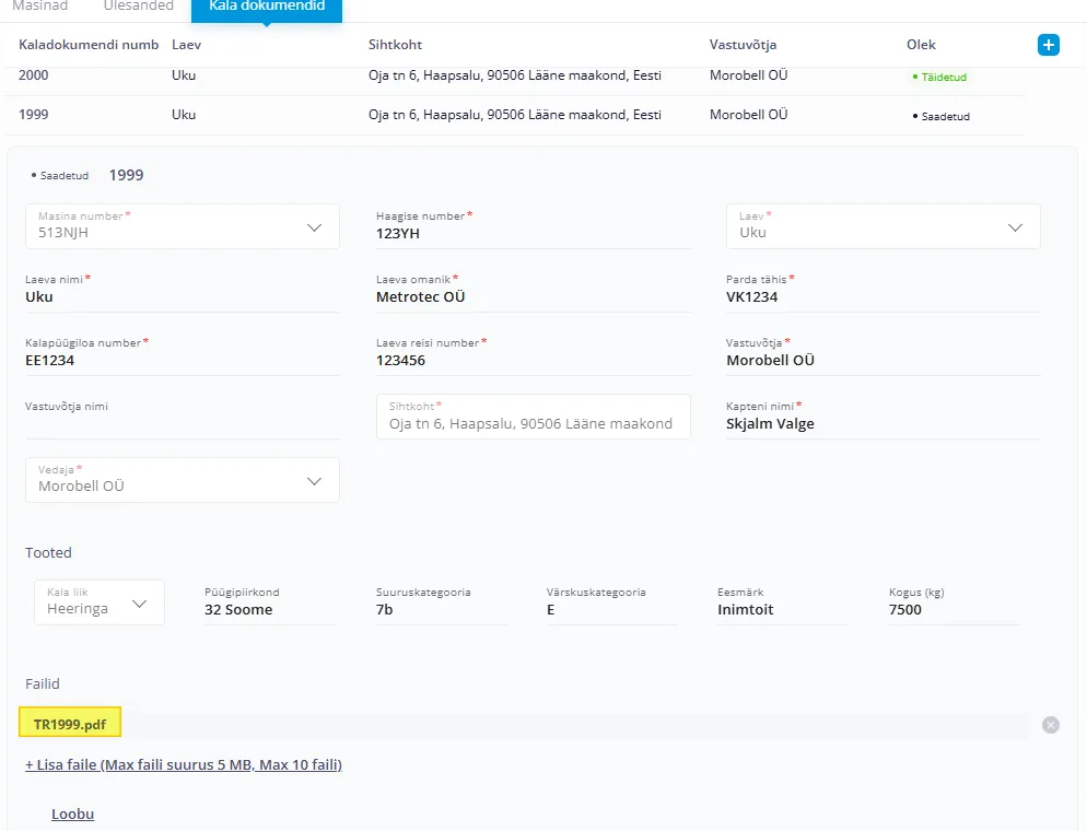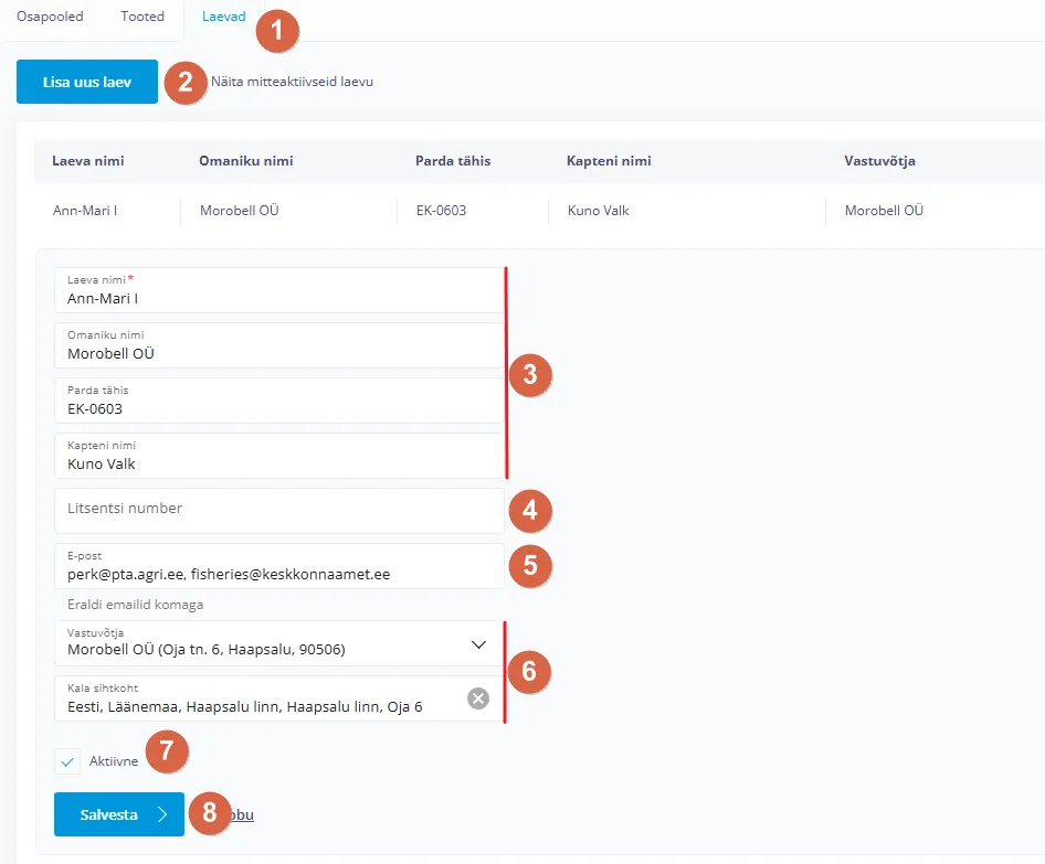 - Lisa laeva andmed (nimi, omanik, pardatähis, kapteni nimi), need andmed lähevad automaatselt kala transpordidokumendile