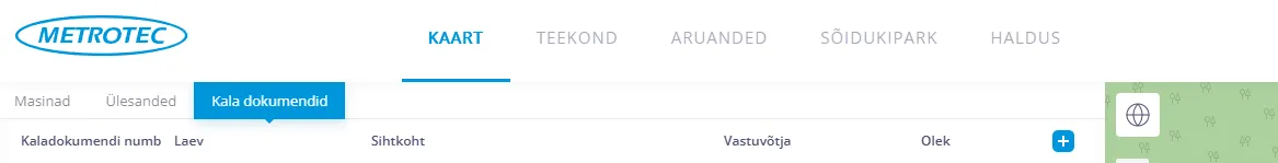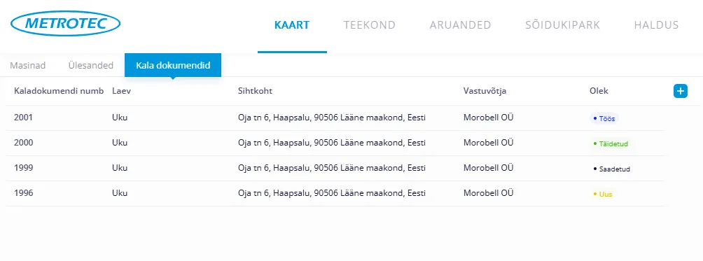 heading.anchorLabelKõik juhtide poolt lisatud saatelehed on koheselt ligipääsetavad admin vaate tasandilt. Kõik jooksva päeva dokumendid on ülesannete mooduli vaate jaotises “Kala dokumendid”. Läbi ajaloo koostatud dokumendid on kättesaadavad aruannetest.