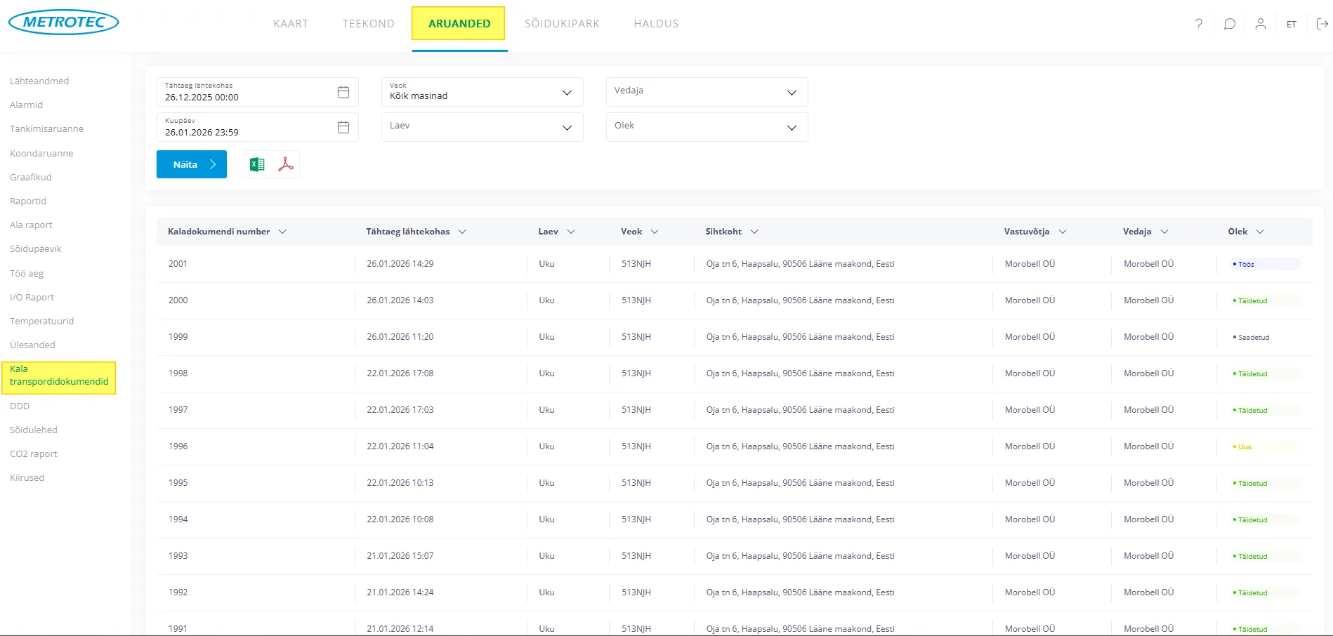 Loendina on esitatud kõik jooksval päeval koostatud kala transpordidokumendid. Siit loendist kaovad täidetud staatusega dokumendid automaatselt peale 00:00-i.