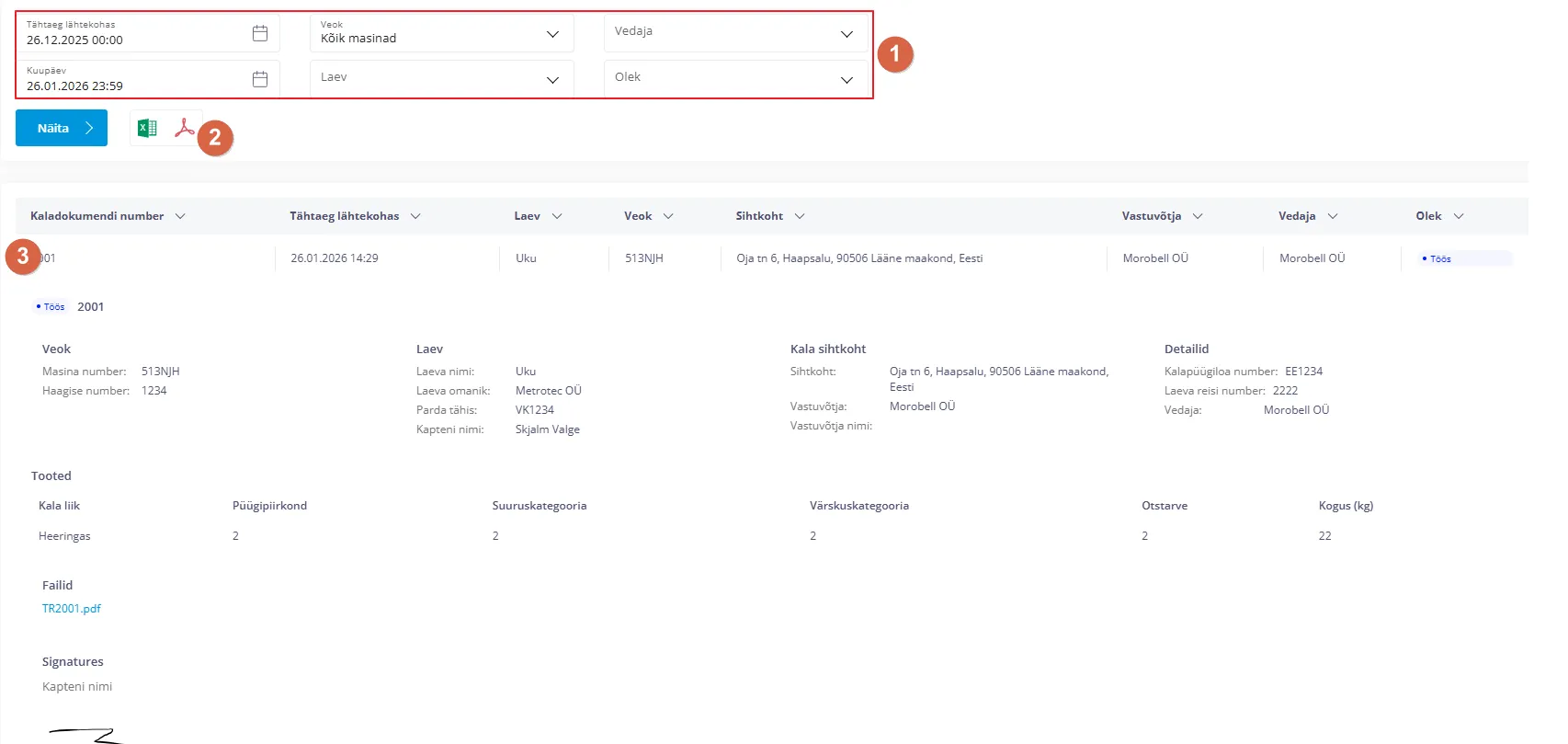 - PDF eksport, luuakse PDF fail kõikide filtreeritud kala transpordidokumentidega