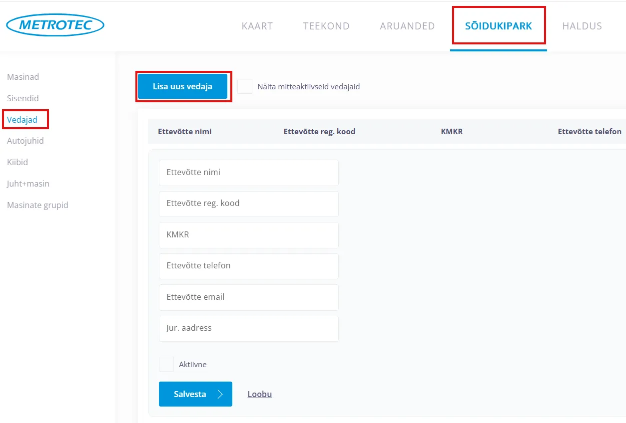 Liigu menüüdes: Sõidukipark > Vedajad > Lisa uus vedaja
