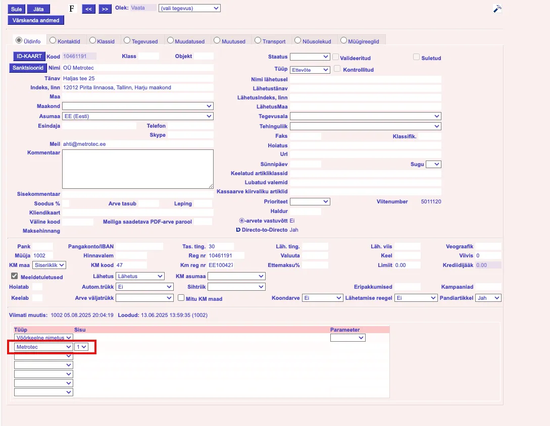 - Kliendikaardi seadistused tellija kontode loomiseks Metroteci platvormile