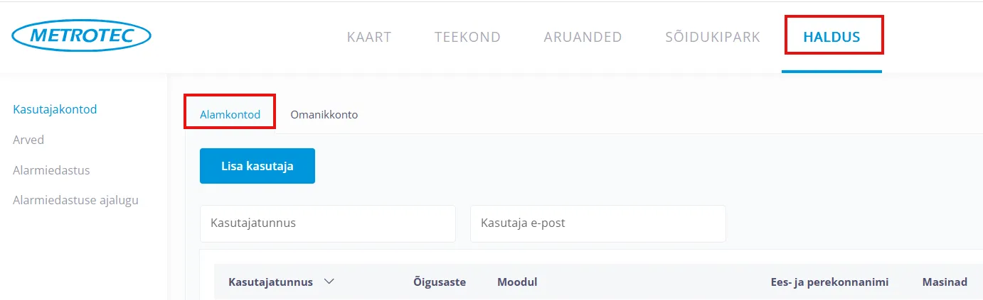 Metrotec keskkonnas on automaatselt loodud kontod nähtavad Haldus > Alamkontod.