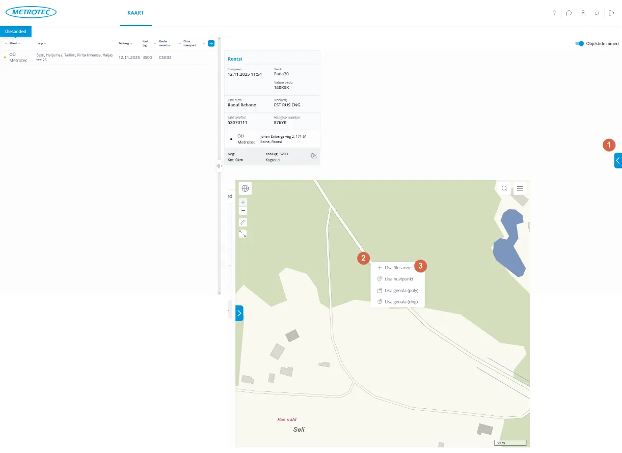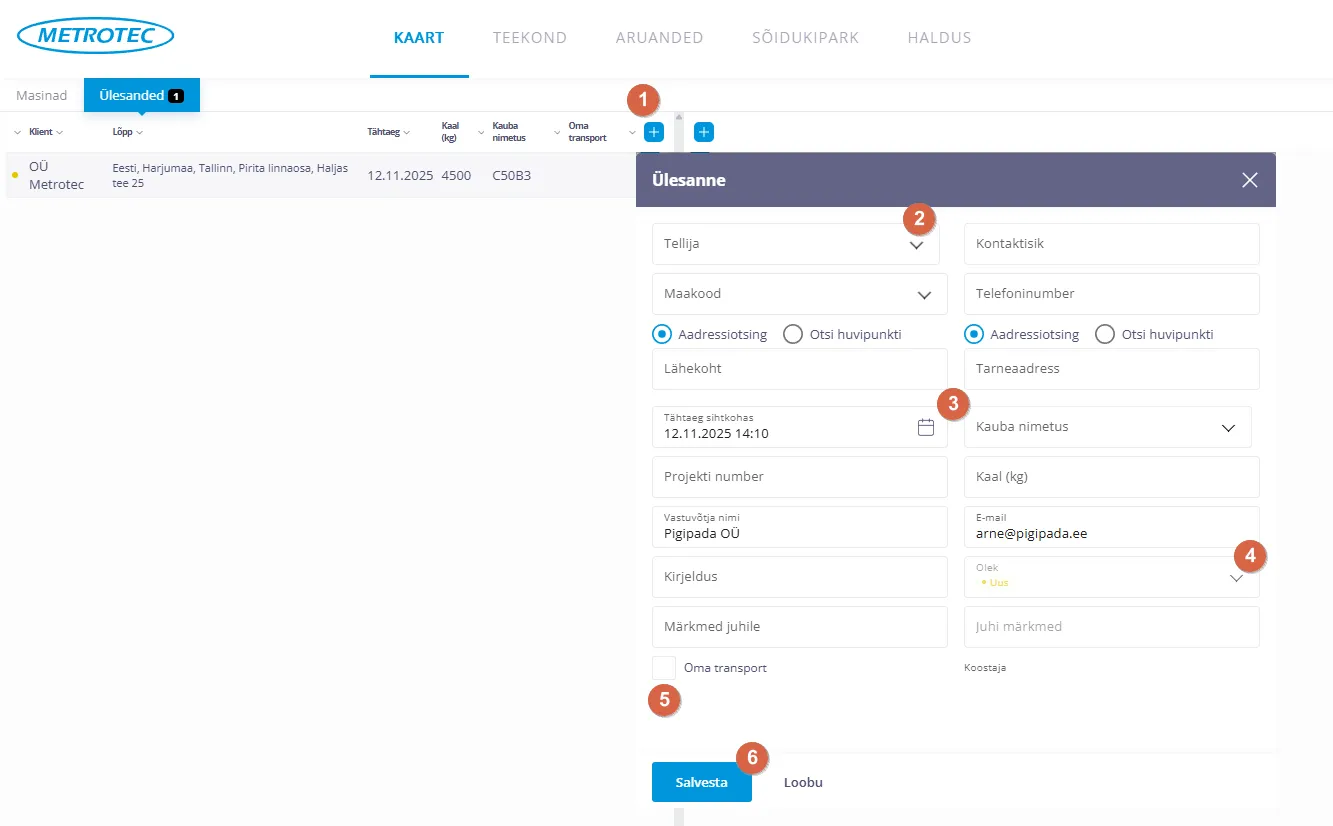 - Kui klient tuleb enda transpordiga, märgi “Oma transport” ja lisa veoki number