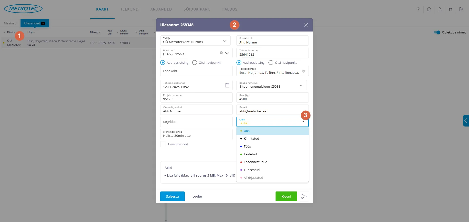 - Juhi nimi, keel telefon – nähtavad ka kliendile tellija vaatest