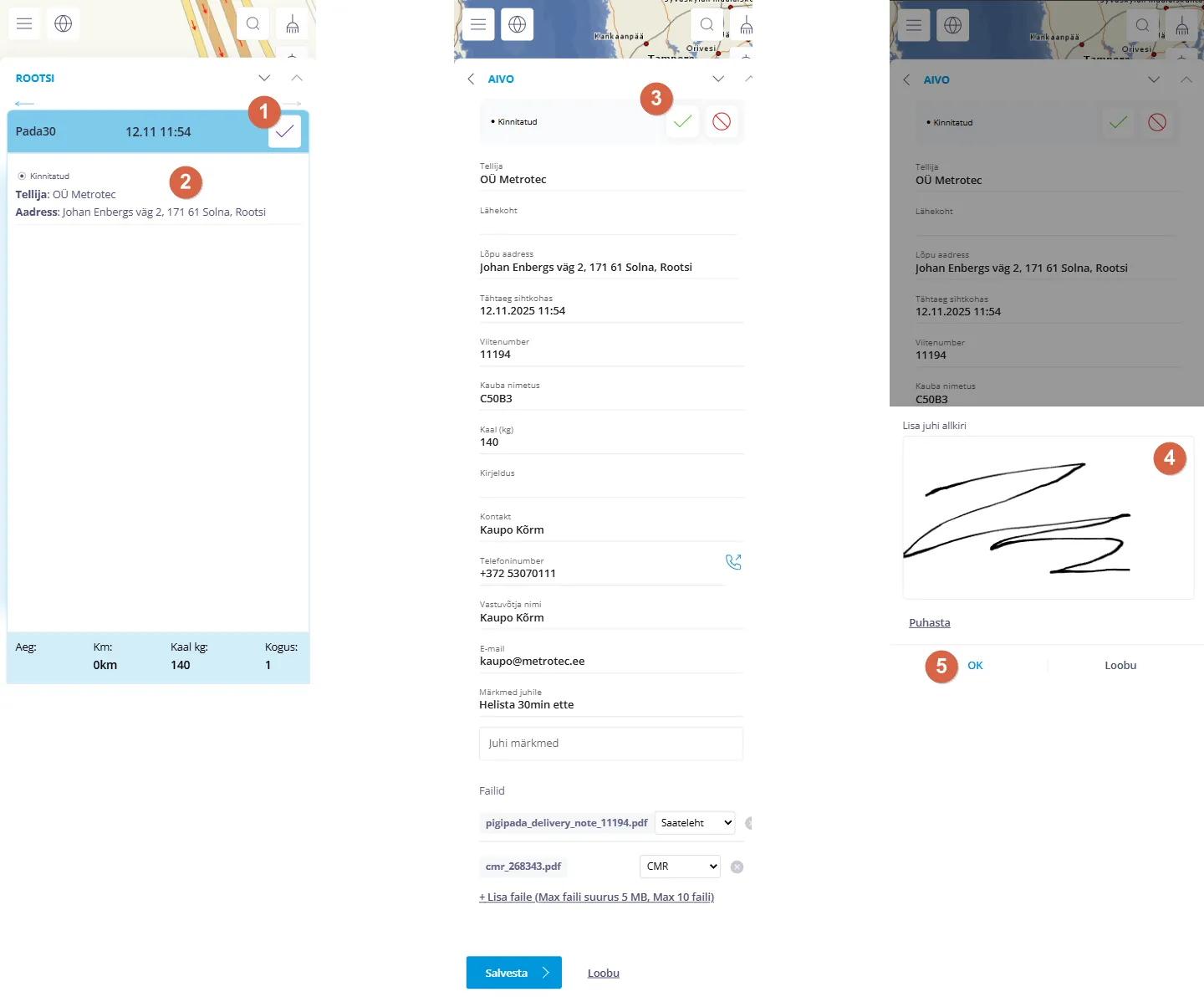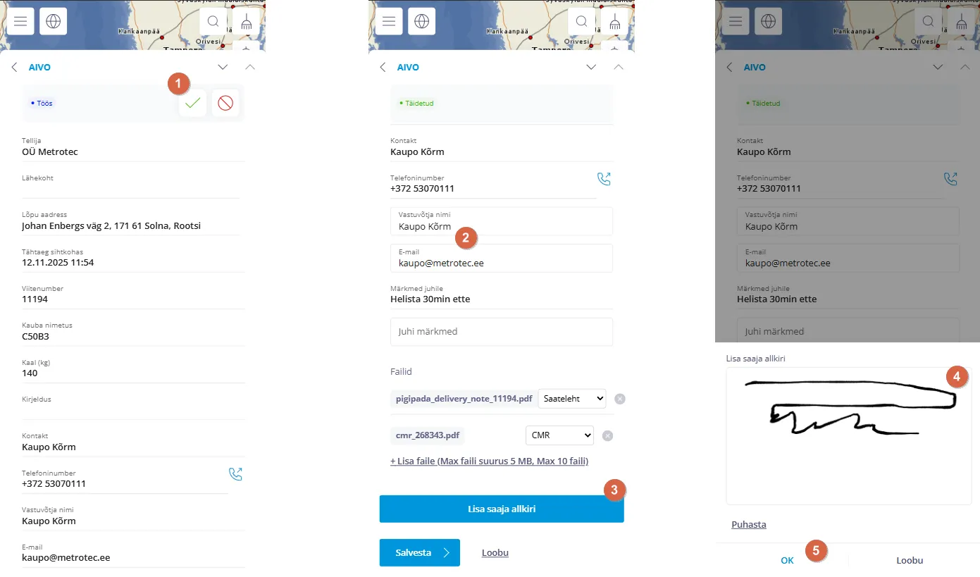 - Sisesta vastuvõtja allkiri (allkirjastatakse saateleht ja CMR)