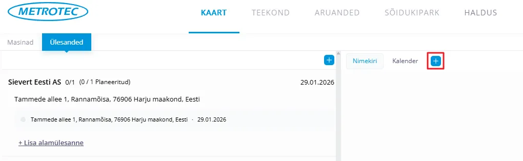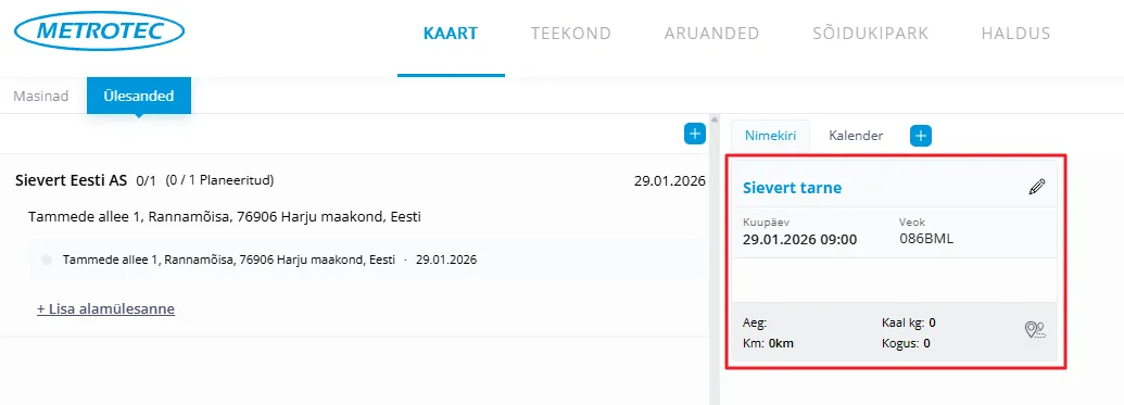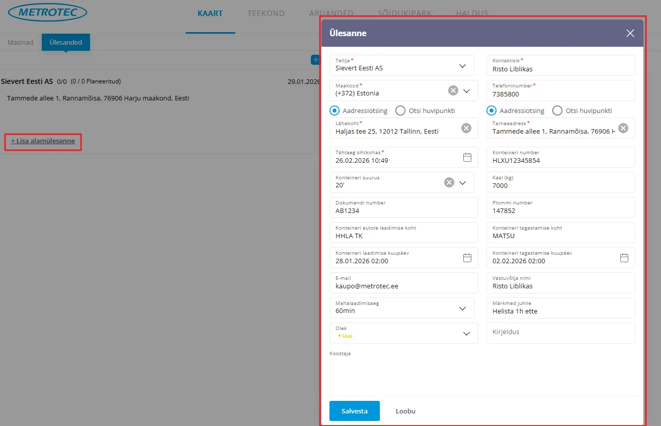 Tellimuse raames teostatavate tööde tarbeks ülesannete ja veoselehtede koostamiseks vajutus tellimuse all oleval + Lisa alamülesanne nupul > avaneb juba eelnevalt sisestatud andmetega ülesannete lisamise vaade. Kui kõik on endine, salvesta uuesti ülesanne. Kui mõne välja muutmine on vajalik, muuda väljad ja salvesta.