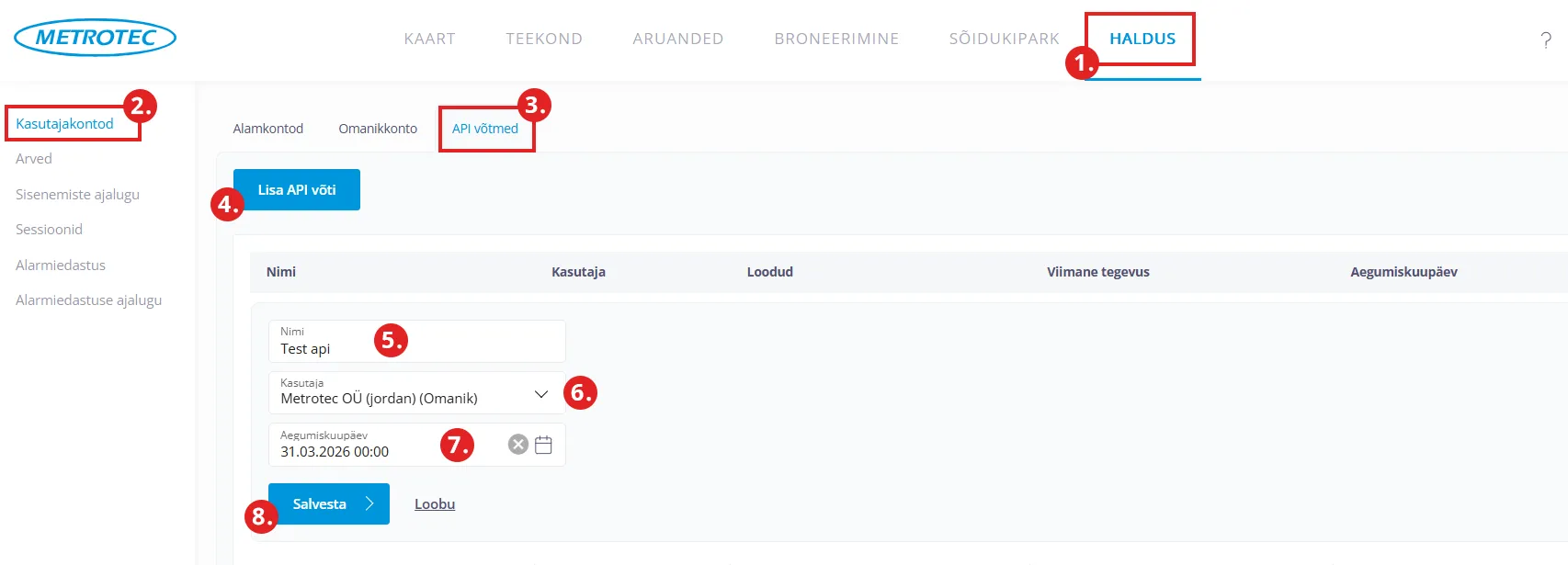 - Kasutaja - Määra võtme kasutaja. Kasutaja valikuga määratletakse API päringute õigused. Kasutajaga saab piirata API poolt kättesaadavate andmete hulka objektide ja andmetabelite lõikes. Teisisõnu, API päringutega saab siusuliselt kätte sama palju infot, nagu on nähtav sellesama kasutajatunnusega visuaalselt veebirakenduses.