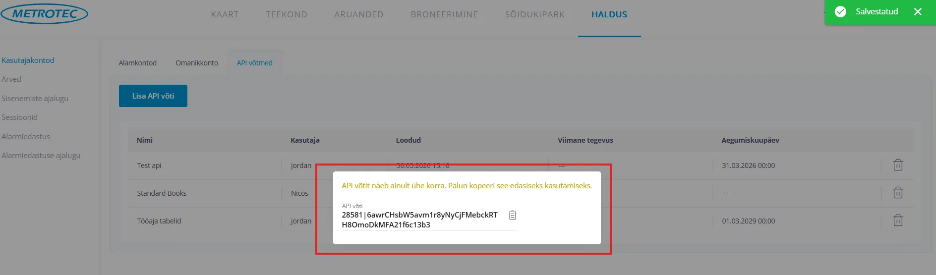 heading.anchorLabelTokeni (API võti) loomine on ainult peakasutaja õigus. Võtme loomisel arvesta, et see on nähtav vaid loomisprotsessi käigus. Kui võti on nähtav, siis siis salvesta see endale ohutusse kohta. Võtme kaotamisel kustuta see admin paneelist ja loo uuesti.