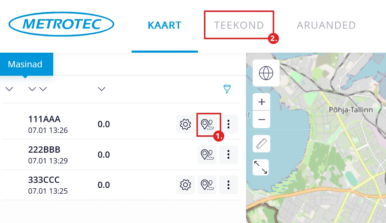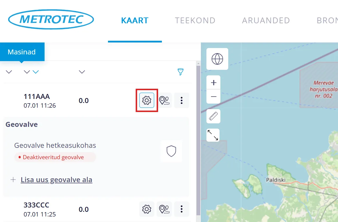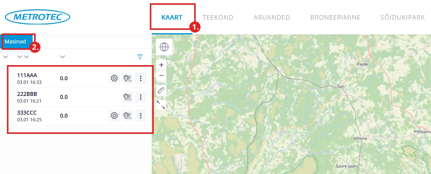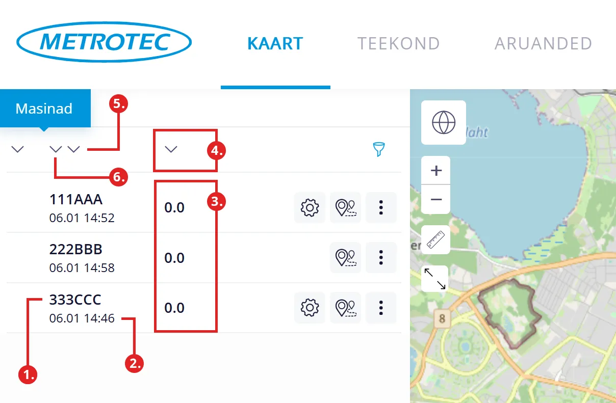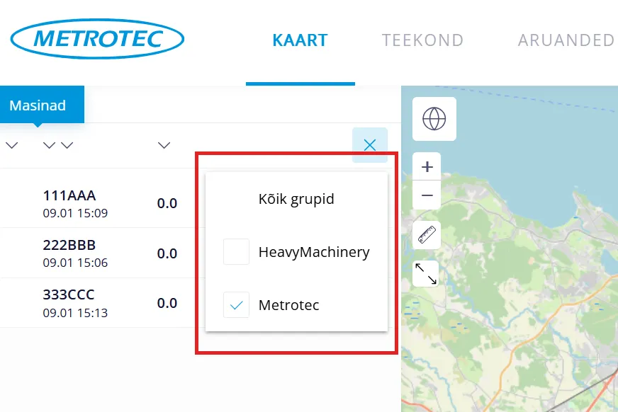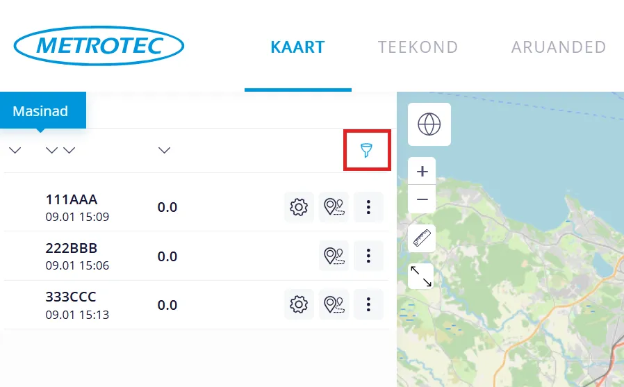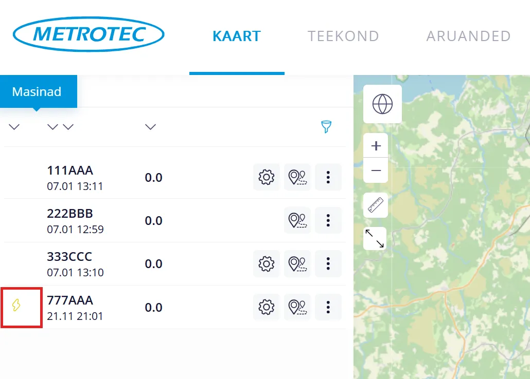 “Masinad” alajaotus asub menüüpunkti “KAART” vasakus ekraaniosas. Sealt saad näha kõiki oma masinaid, millele on