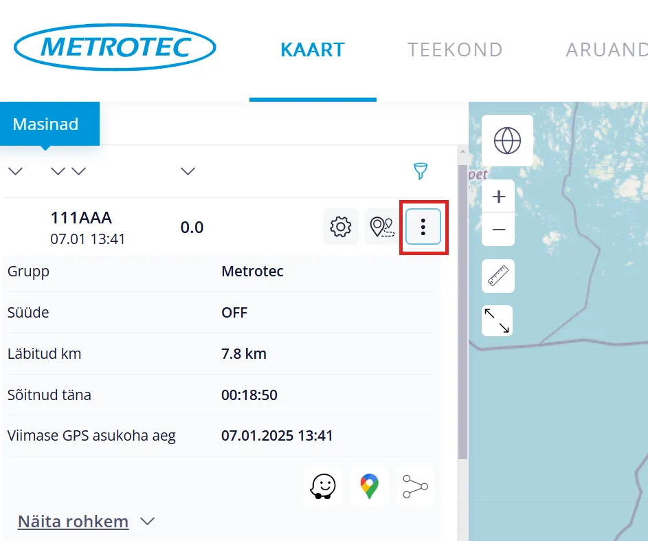 “Kolme punkti” ikoonile klikkides avaneb masina kohta täiendav info.