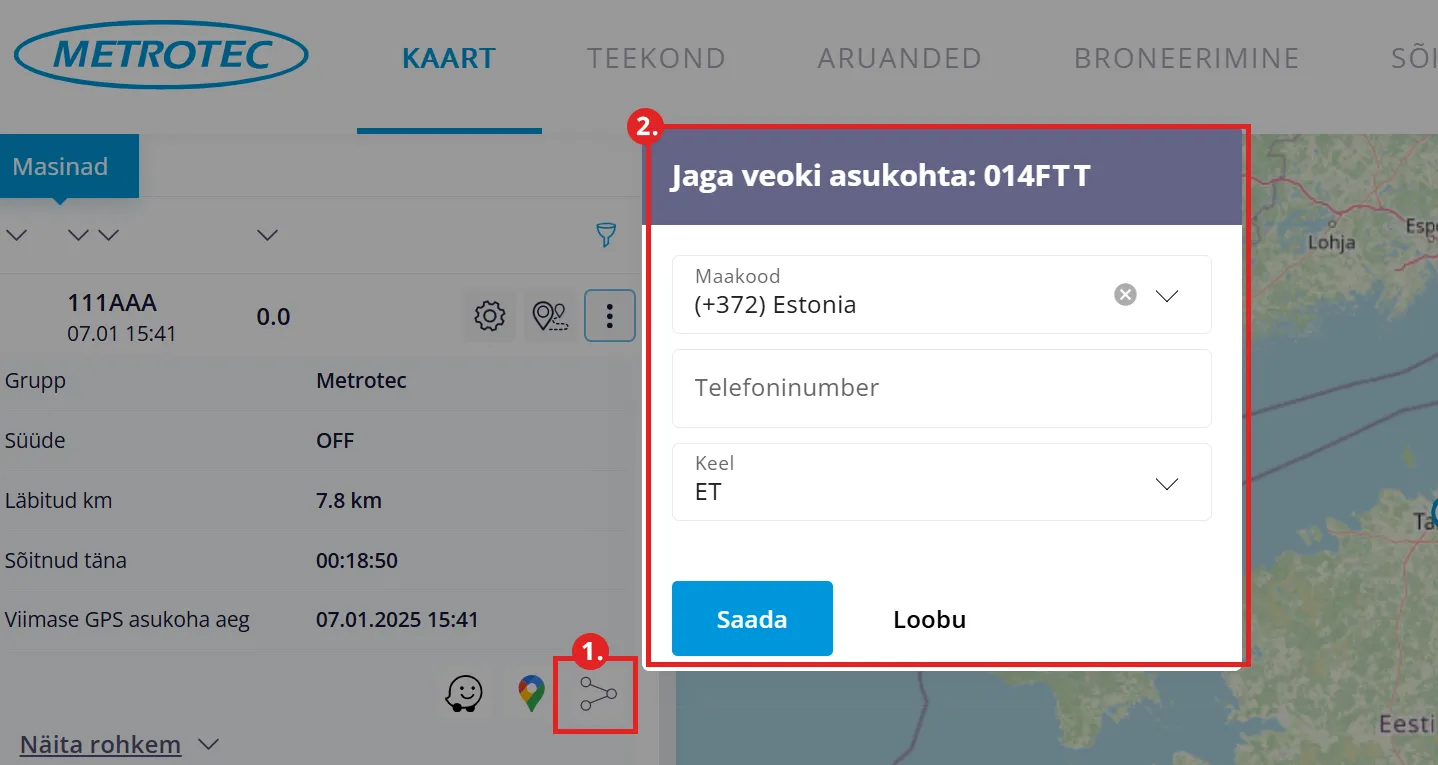 Avanenud aknakeses vali “Maakood”, sisesta “Telefoninumber” kuhu soovid asukohta jagada. Vali keel (praegu on valikus järgmised keeled: eesti, vene, inglise, rootsi ja läti). Lõpuks vajuta nupul “Saada”. Kui avasid akna kogemata siis vajuta nupul “Loobu”.